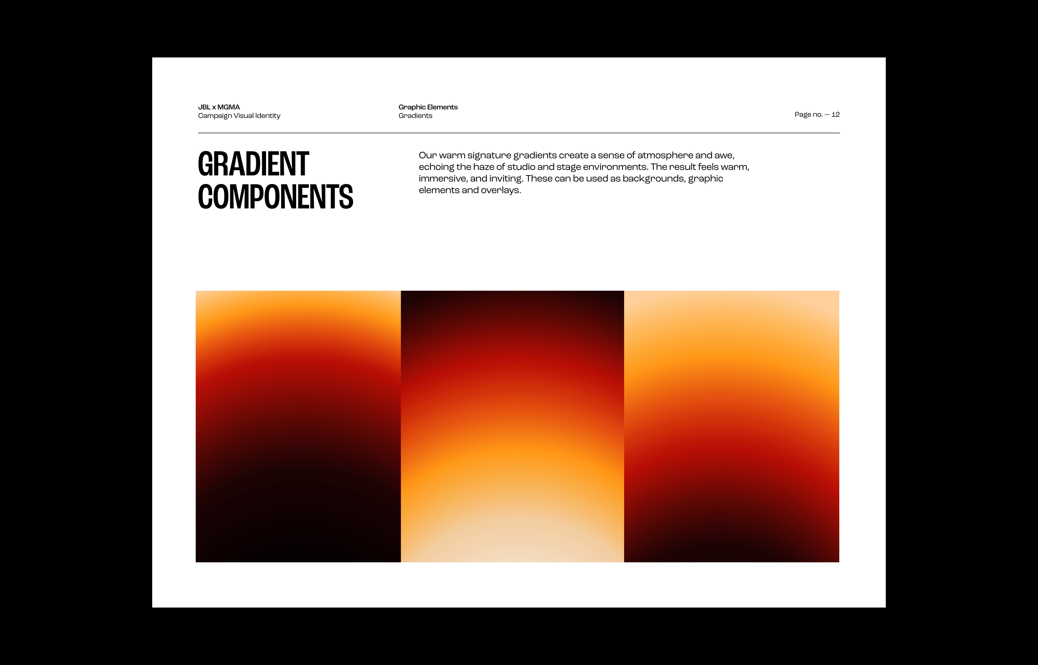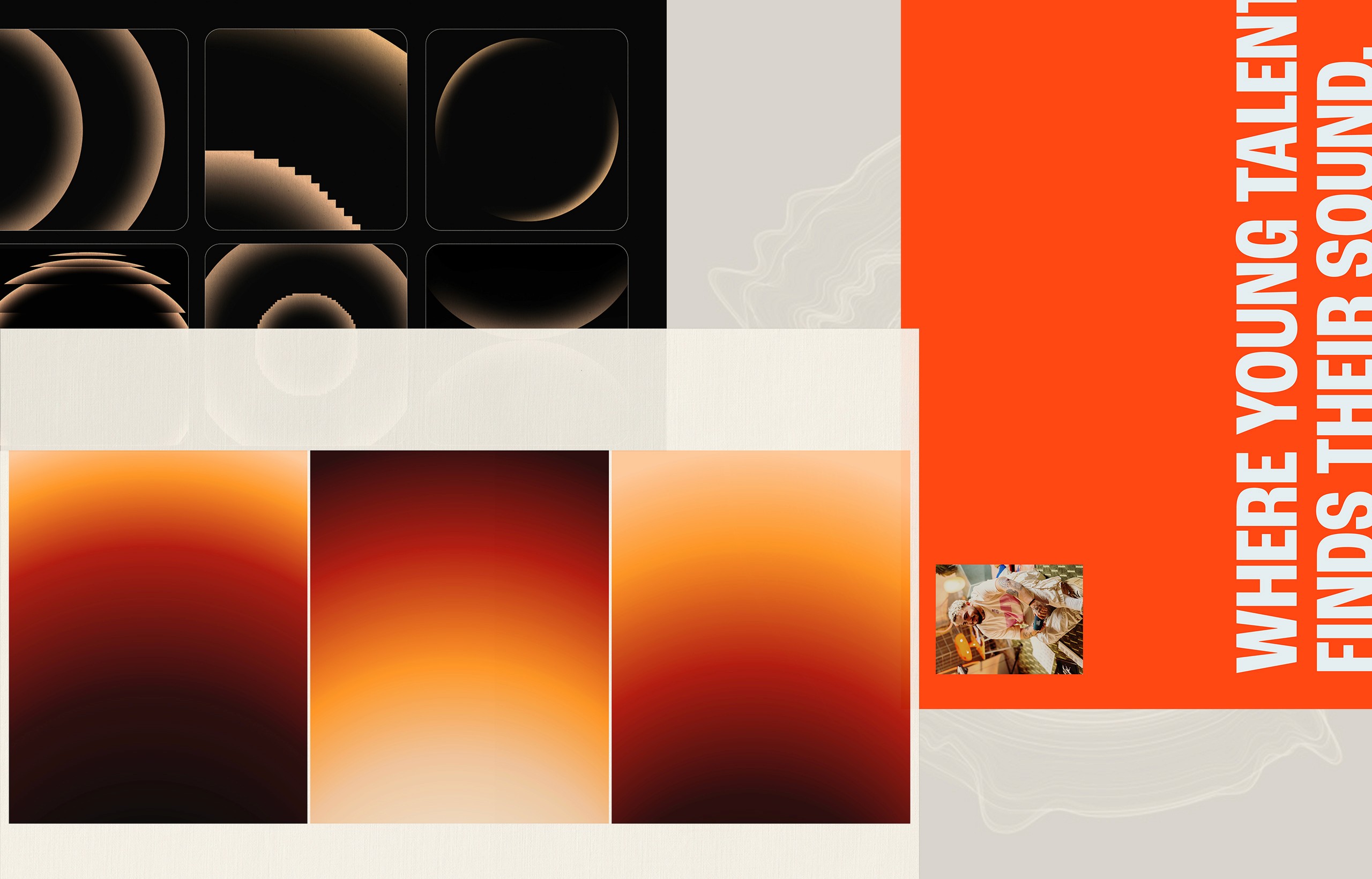 The visual system mirrors musical structure, using layered gradients, rhythmic forms, and atmospheric textures to translate sound into feeling. JBL’s signature orange was reworked into a warm haze inspired by studio environments and live moments.